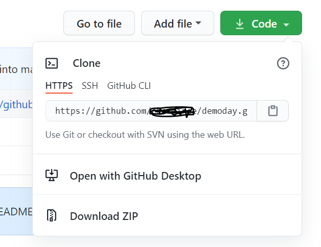 초록색 code버튼 > clone > HTTPS에 있는 주소를 복사/붙여넣기 하면, 본인의 컴퓨터에 깃헙 레퍼지토리가 복제됩니다.