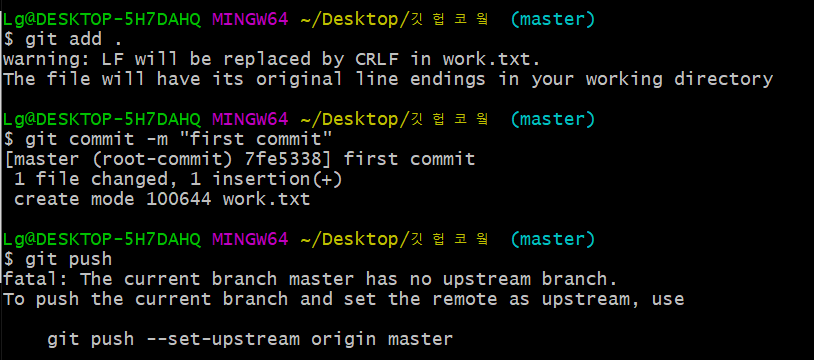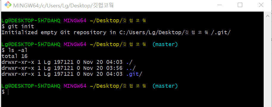 제 폴더의 위치는 `C:\Users\Lg\Desktop\깃헙코웤`이네요.