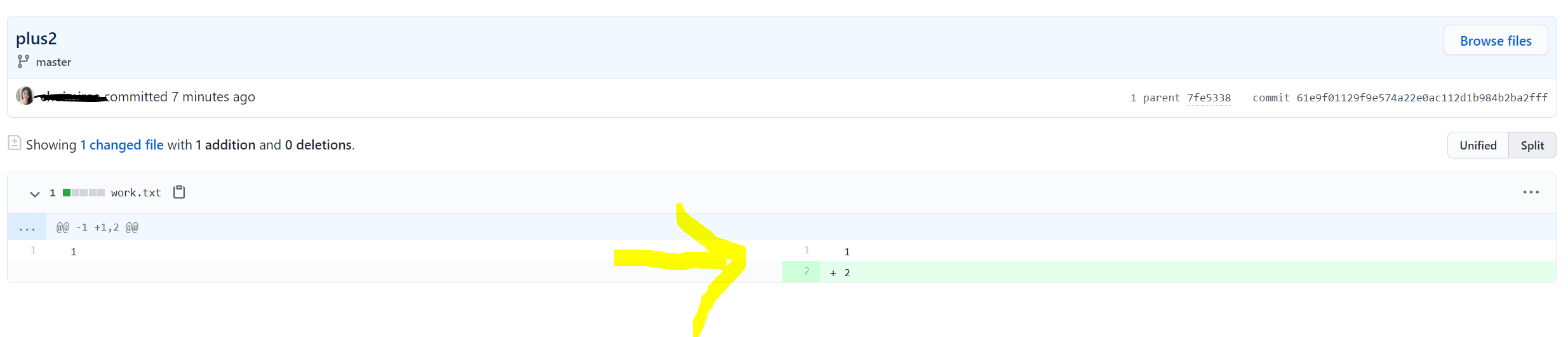 추가로, 커밋명(plus2)를 누르면, 어디에서 어떻게 바꼈는지 수정사항도 알 수 있습니다.