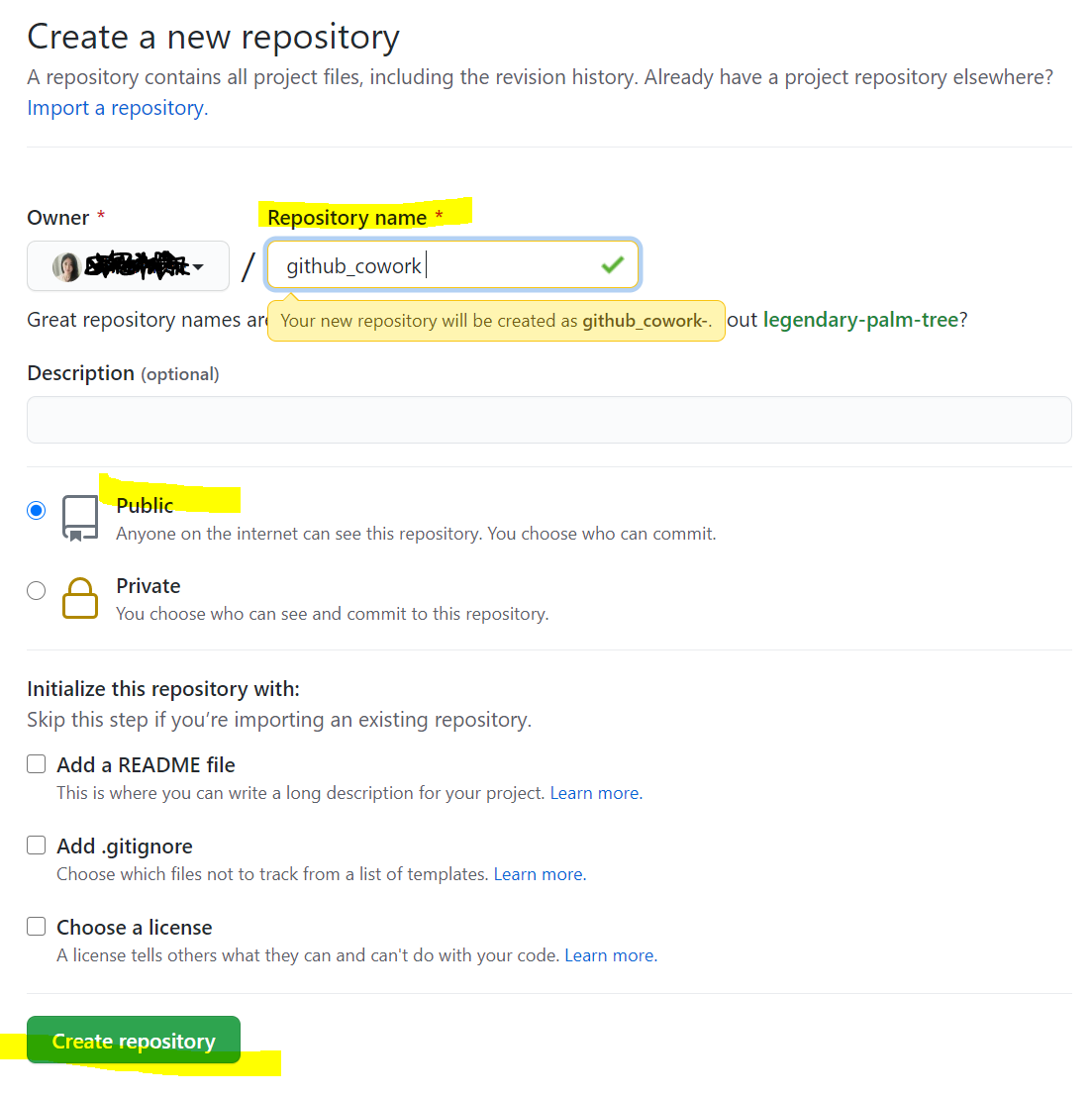New repository > repository name 설정 > Public(공개) > Create repository 하면 new repository가 만들어집니다.
