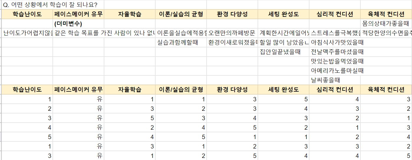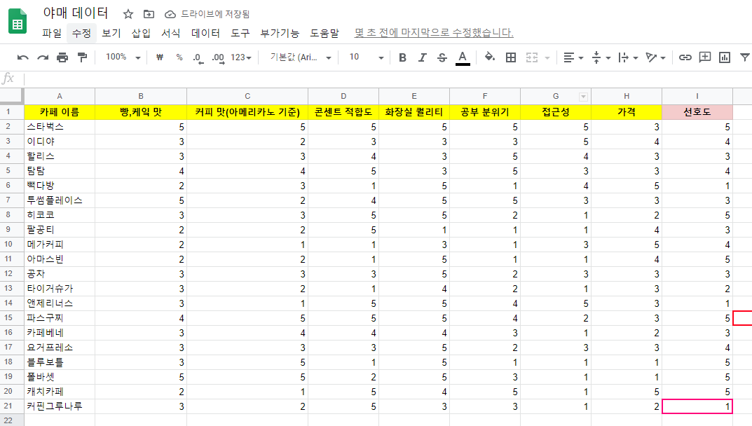 우리는 '빵,케잌의 맛, 커피맛, 콘센트 적합도, 화장실 퀄리티, 공부분위기, 접근성, 가격'에 1점~5점까지의 점수를 매기고 '선호도'에 어떤 영향을 줄지 (야매로)분석해보려 했다.
